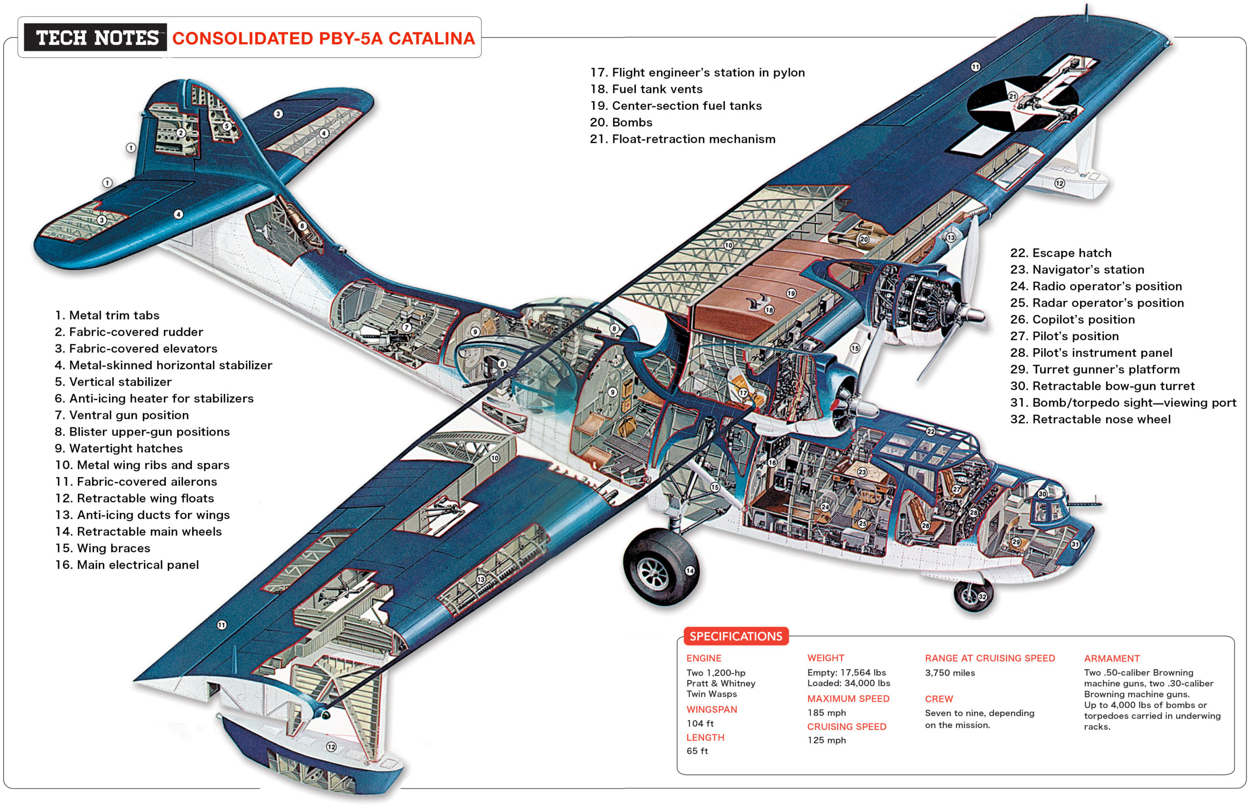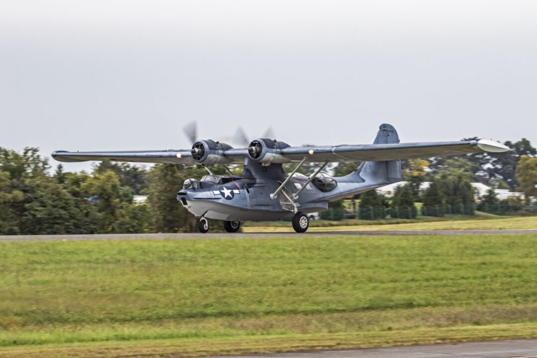 Parfois affectueusement surnommé le « Pig Boat » par ses équipages, le PBY se définissait par son autonomie et son endurance exceptionnelle, mais il était aussi incroyablement lent, avec une vitesse de croisière de seulement 200 km/h. Nommé d’après l’île de Catalina au large des côtes californiennes, plus de 3 300 PBY ont été construits pendant la guerre. Comme pour tous les aéronefs de la Marine, l’indicatif PBY contient une description du rôle de l’aéronef et du fabricant. Dans ce cas, le bombardier de patrouille – avec le code du fabricant « Y » représentant la Consolidated Aircraft Corporation.
