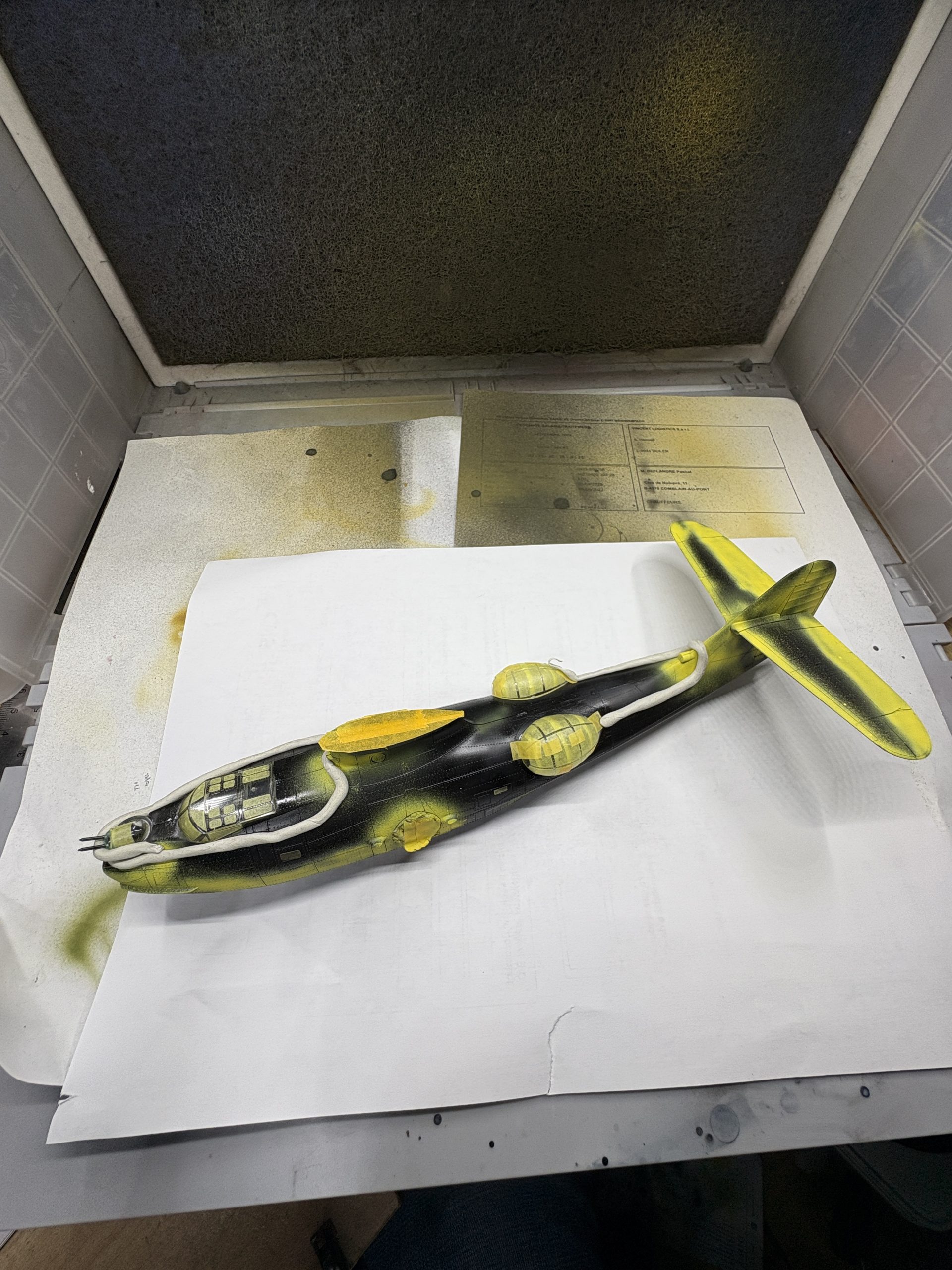 Début des peintures plutôt contraignantes, du faite que la maquette ne rentre pas dans ma cabine mais il y à possibilité de le faire en deux parties la carlingue et l'aille encore trop grande.