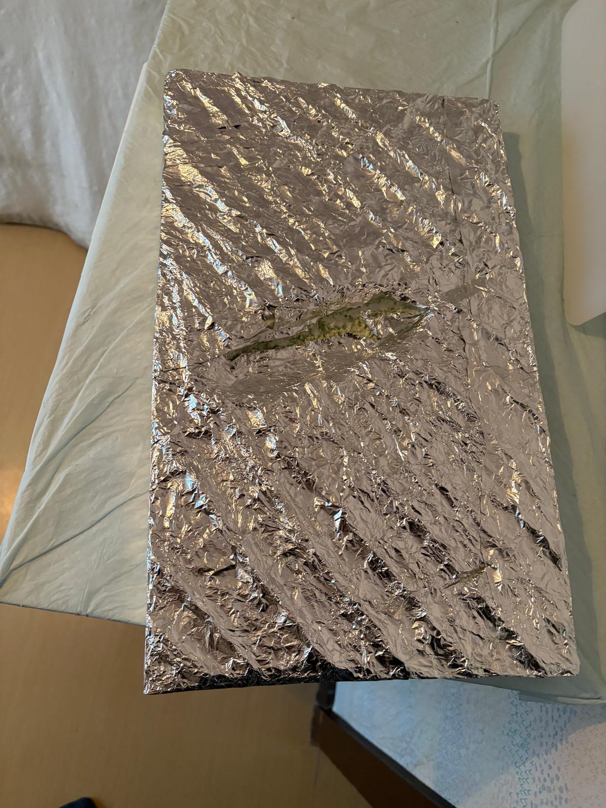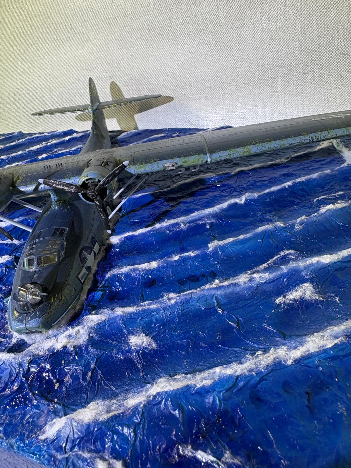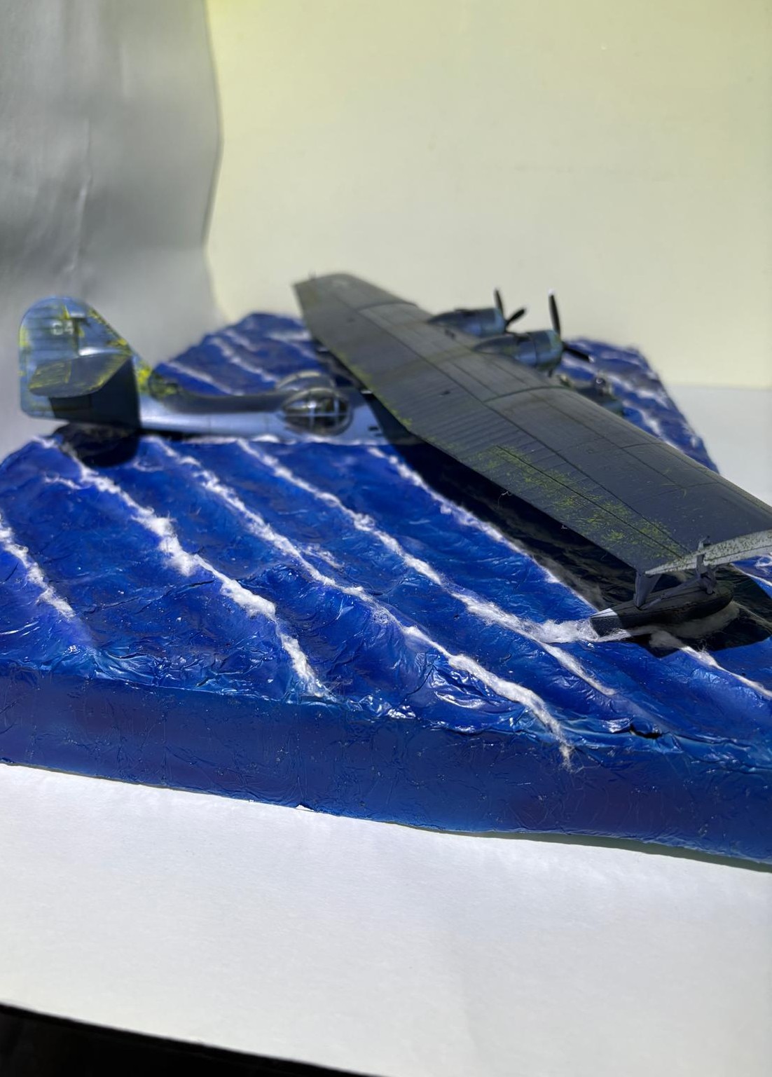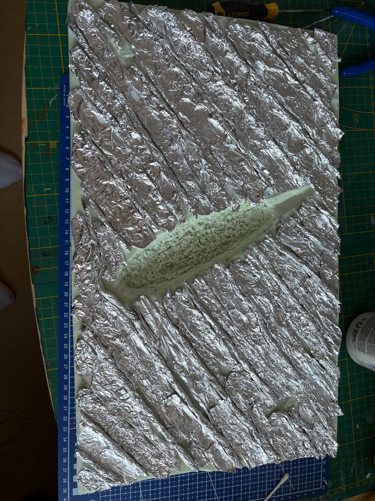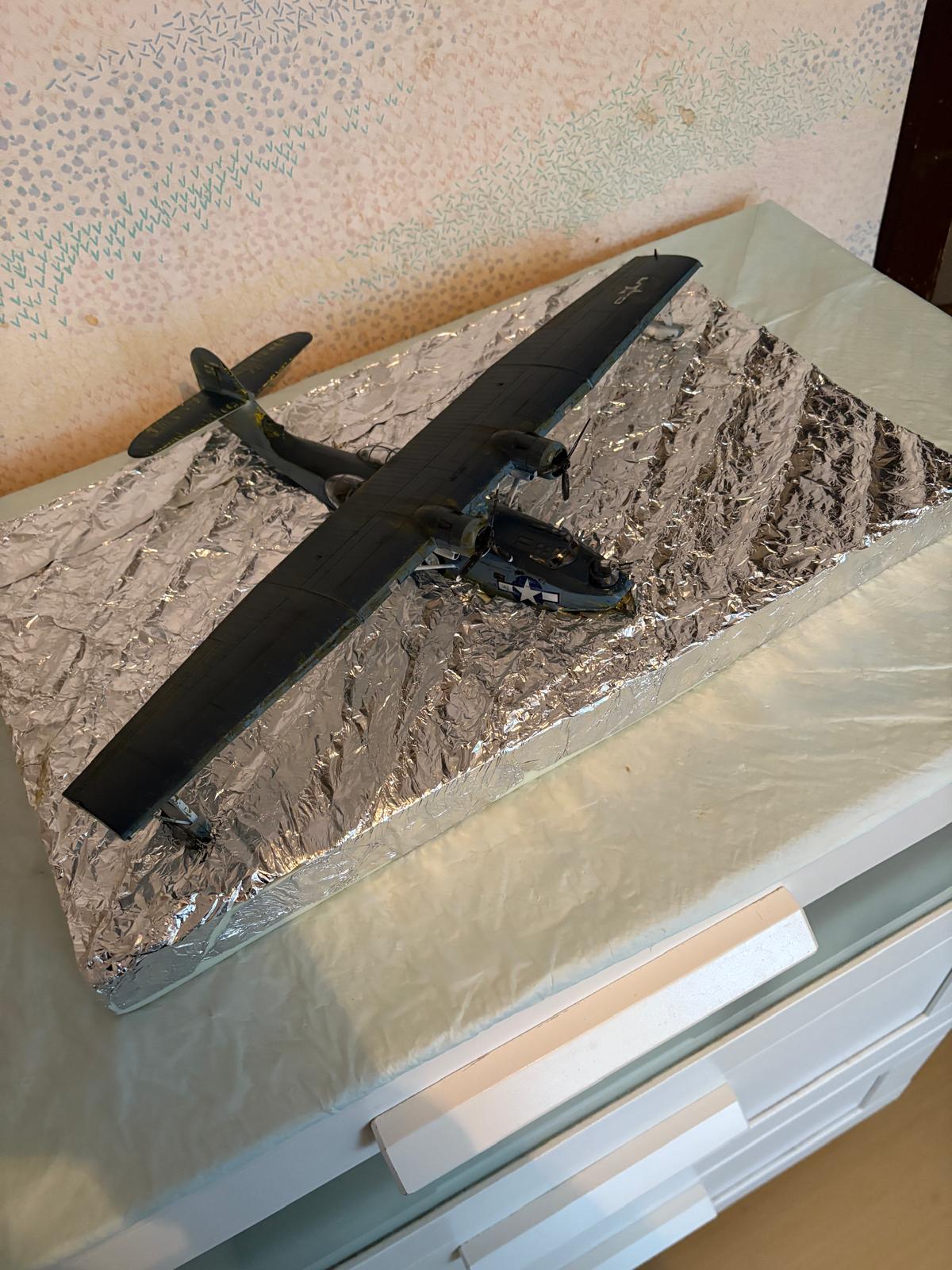 Dans la mousse je creuse l'empreinte de hydravion en me repèrent sur des photos pour voire ou ce trouve la ligne de flottaison, ensuite je créer des vagues avec de l'aluminium que je roule en boudin et colle avec la colle a bois et entre les boudins j'applique des bandes d'aluminium chiffonnées . Après plusieurs heures de séchage je recolle une grande feuille d'aluminium que j'ai au préalable froissée puis retendue pour adoucir les vagues.