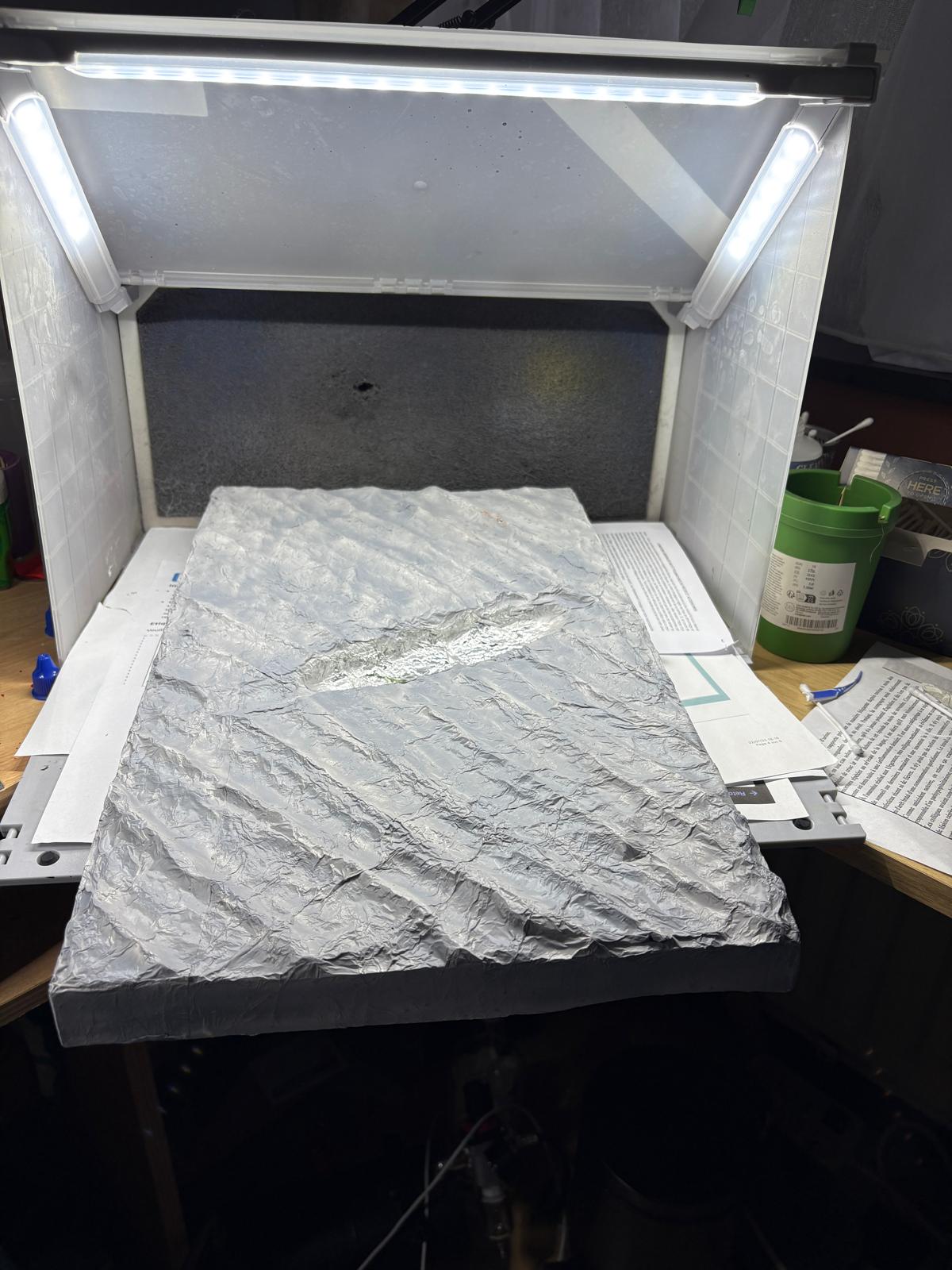 pour mon diorama j'utilise une plaque de mouse, de l'aluminium alimentaire et de la colle a bois.